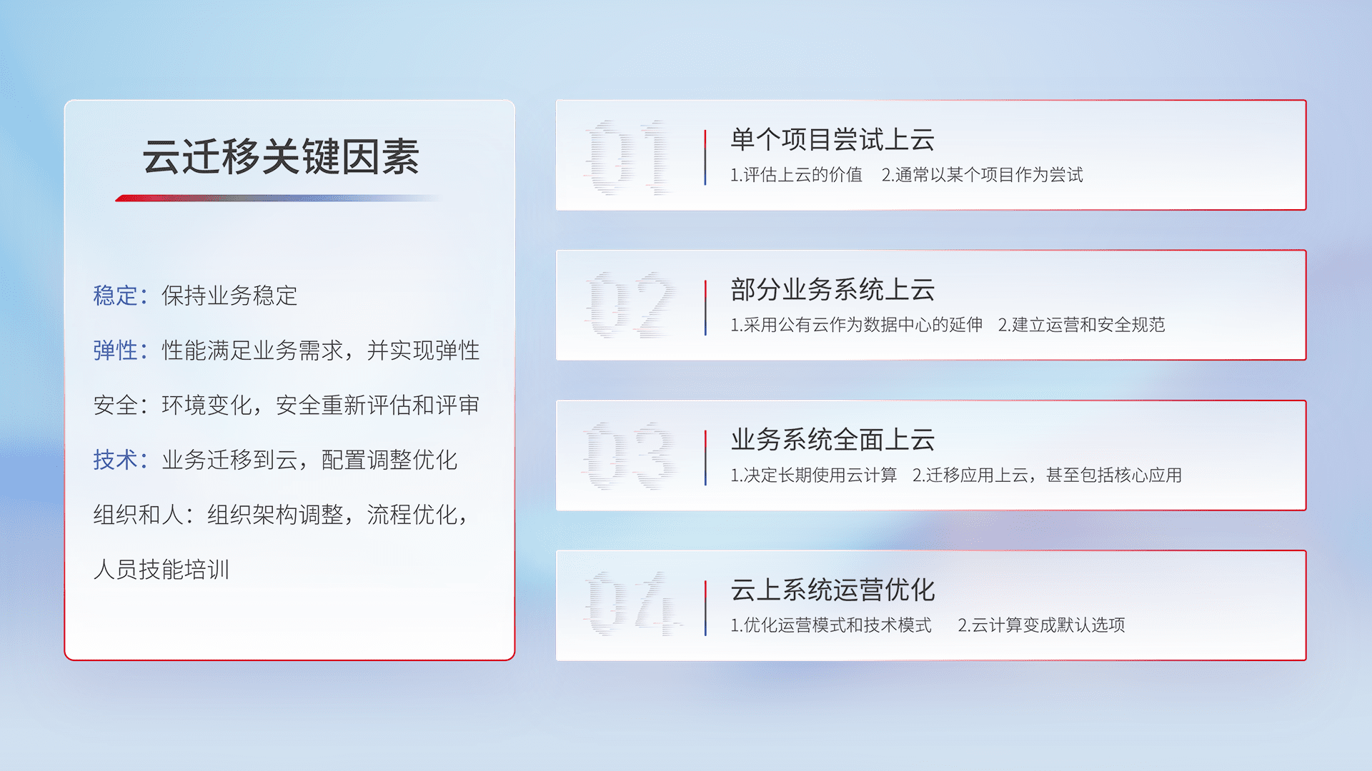 结合实际业务,,,,从规划设计、、、云平台选型、、云原生改造、、、、数据迁移、、、、集成交付,,,迁移全过程为客户识别最佳上云路径,,做好风险识别管理,,设计网络架构、、身份权限、、、、安全审计合规、、操作审计、、、日志审计、、监控告警策略、、、、多站点容灾设计等,,,,对云上基础设施进行整体规划,,,提升IT治理水平,,以满足弹性、、高可用、、、高性能的需求。。。