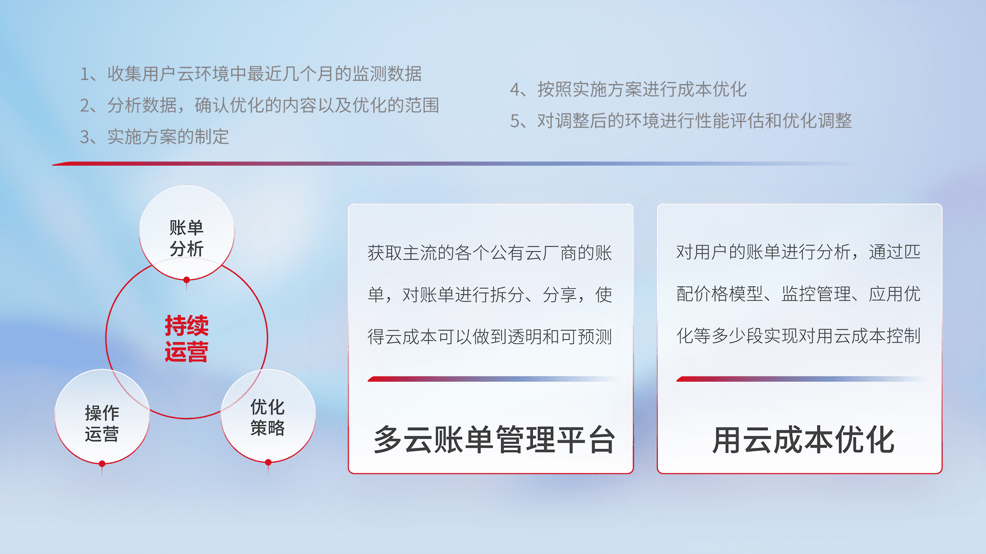 通过多云纳管,,以统一的资源数据模型把客户的云资源进行抽象和封装,,,进而实现对多云资源的统一操作,,,保障云资源管理的可靠性、、、、稳定性与可用性。。量身定制化运维内容,,,配置、、开发运维、、、、补丁管理、、备份、、监控、、认证和访问管理、、、审计和日常巡检等,,保障在用云过程中的可靠度,,,,稳定度以及高可用率。。。。